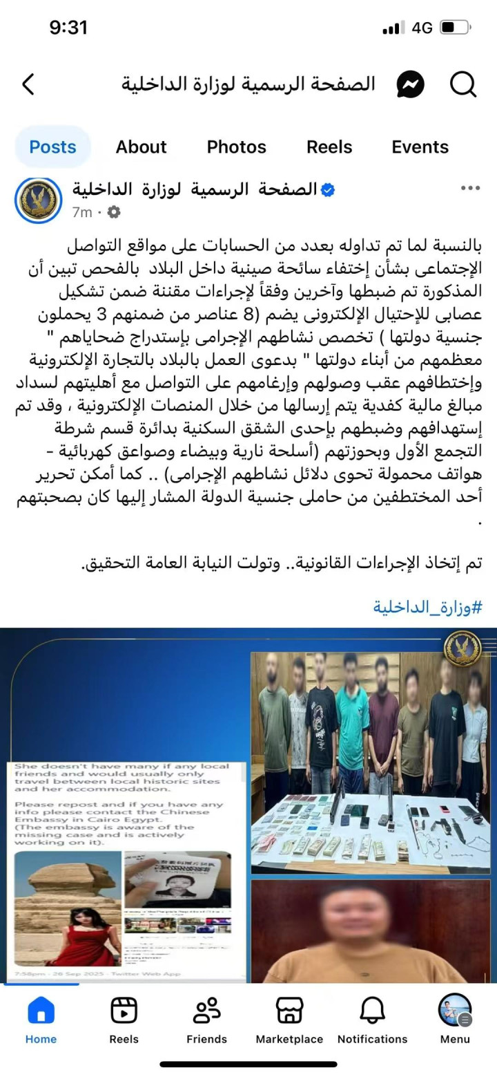 北京时间9月30日凌晨,埃及内政部官方社交账号发文对此进行了通报,文中称:关于部分社交媒体账号所传播的有关一名中国女游客在埃及境内失踪的消息。经调查核实,她与其他几人已被依法控制,因其隶属于一个专门从事电子诈骗的犯罪团伙(该团伙共8名成员)。该团伙的犯罪活动主要是以在埃及从事电子商务工作为名,诱骗受害者(大部分是其本国同胞),待其抵达后便实施绑架,并强迫他们与家人联系,以支付通过电子平台发送的赎金。警方已在其位于第一定居点警察分局辖区的一所住宅公寓内将他们锁定并逮捕,并查获了枪支、白刃武器、电击枪以及若干包含其犯罪活动证据的手机。同时,一名与她在一起的、上述国籍的被绑架者也已获救。